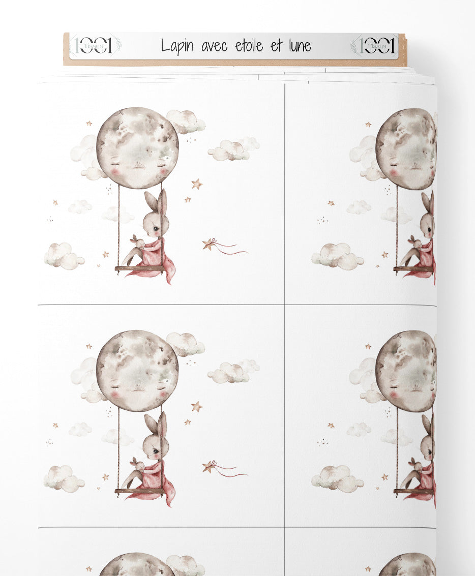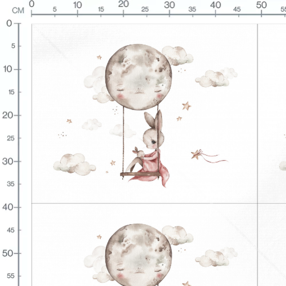 La lune a un visage endormi et est entourée de petits nuages doux. Des étoiles beige parsèment le ciel autour du lapin. Le lapin porte une robe rose et tient une petite étoile.Les tissus