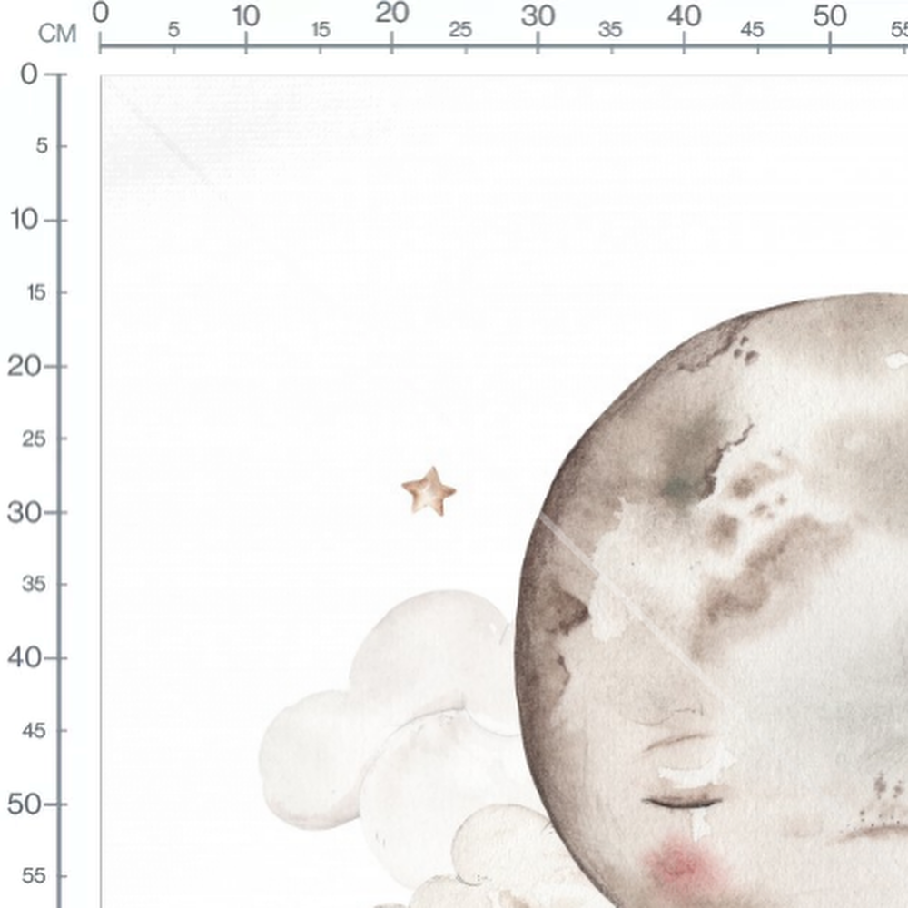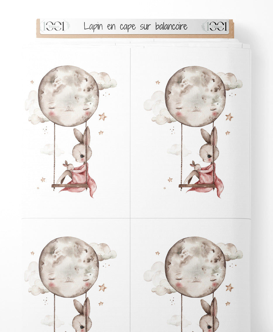 La lune a un visage endormi et est entourée de petits nuages doux. Des étoiles dorées parsèment le ciel autour du lapin vêtu d'une cape rose.Les tissus