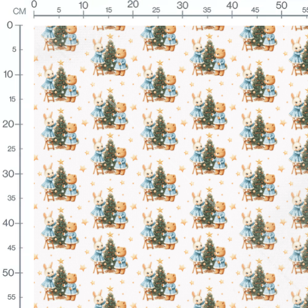 Le lapin est sur une échelle, ajoutant des décorations au sapin. L'ours tient une boule de Noël, prêt à l'accrocher. Le sapin est orné de boules et d'étoiles dorées. Les personnages portent des vêtements assortis en bleu clair.Les tissus