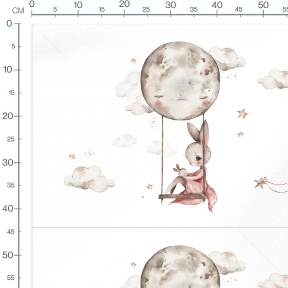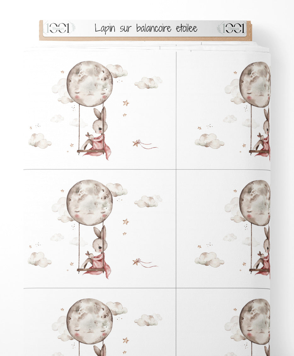 La lune a un visage endormi et est entourée de petits nuages doux. Des étoiles et une étoile filante ajoutent une touche de magie au motif.Les tissus