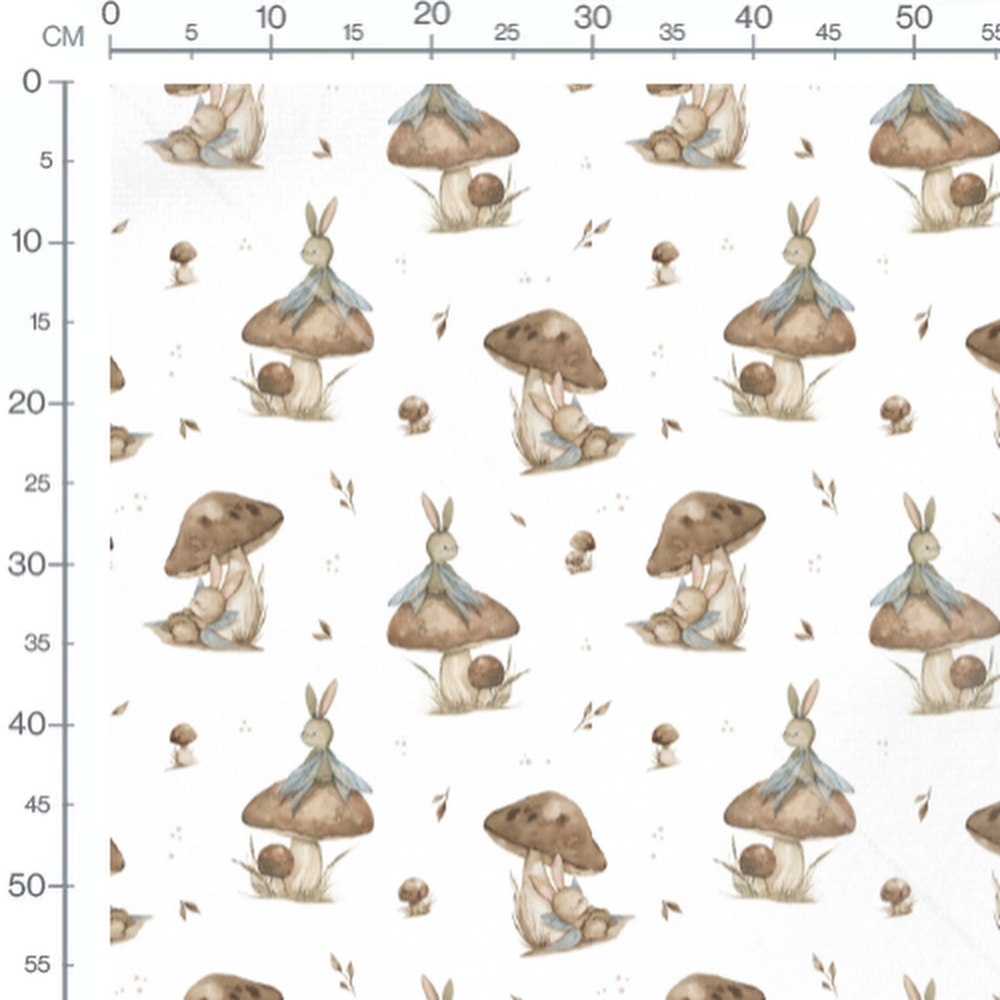 Les lapins portent de délicates ailes bleues. Les champignons sont de différentes tailles et nuances de brun. De petites herbes et feuilles ajoutent des détails subtils au motif.Les tissus