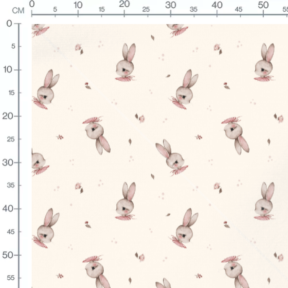 Les lapins sont dessinés dans des tons doux et aquarelle. Les fleurs roses ajoutent une touche délicate au motif. De petites feuilles brunes complètent le design.Les tissus
