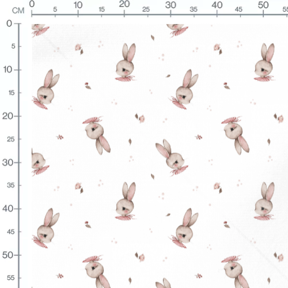 Les lapins sont dessinés avec des détails délicats et des teintes douces. Les fleurs ajoutent une touche de couleur subtile. Les points roses complètent le motif avec élégance.Les tissus