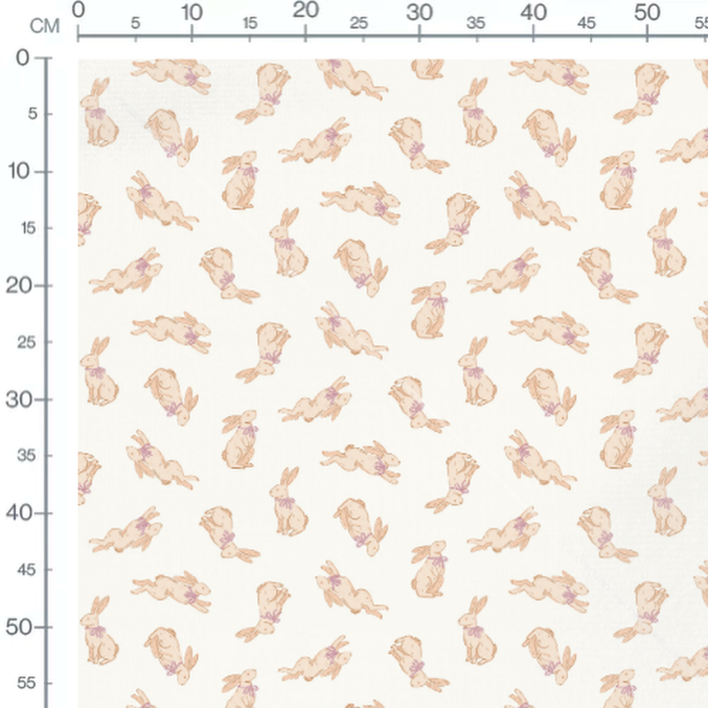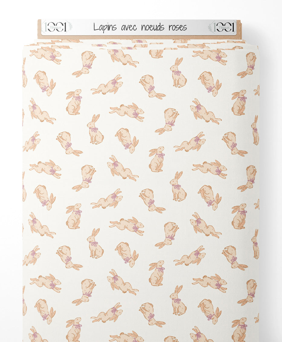 Les lapins sont dessinés dans des tons doux avec des nœuds roses autour du cou. Chaque lapin est représenté dans une pose unique, ajoutant de la variété au motif.Les tissus