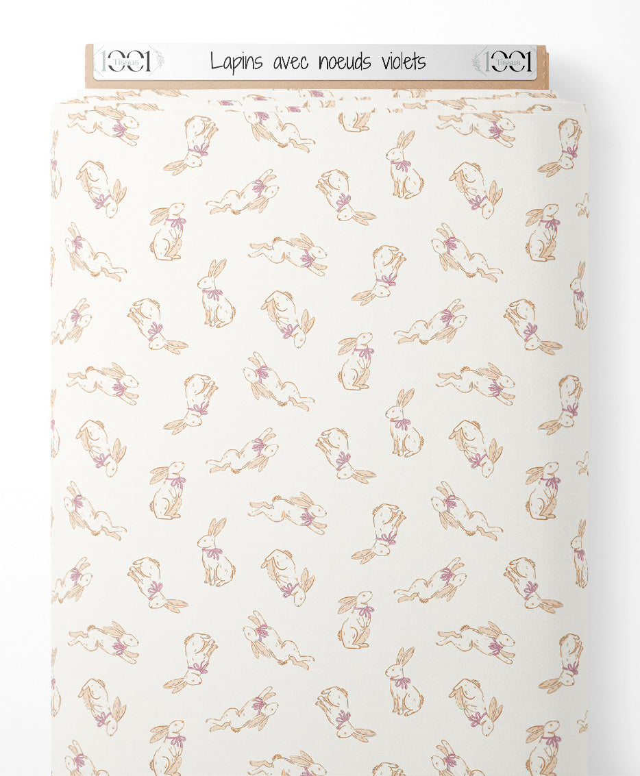 Les lapins sont représentés dans différentes positions. Chaque lapin porte un nœud violet autour du cou.Les tissus