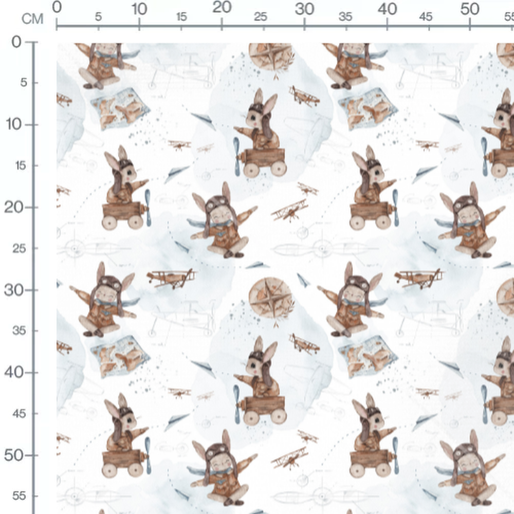 Les lapins portent des casques d'aviateur et sont assis dans des avions en bois. Des avions vintage et des cartes sont illustrés autour d'eux. Des traces de vol et des avions en papier complètent le motif.Les tissus