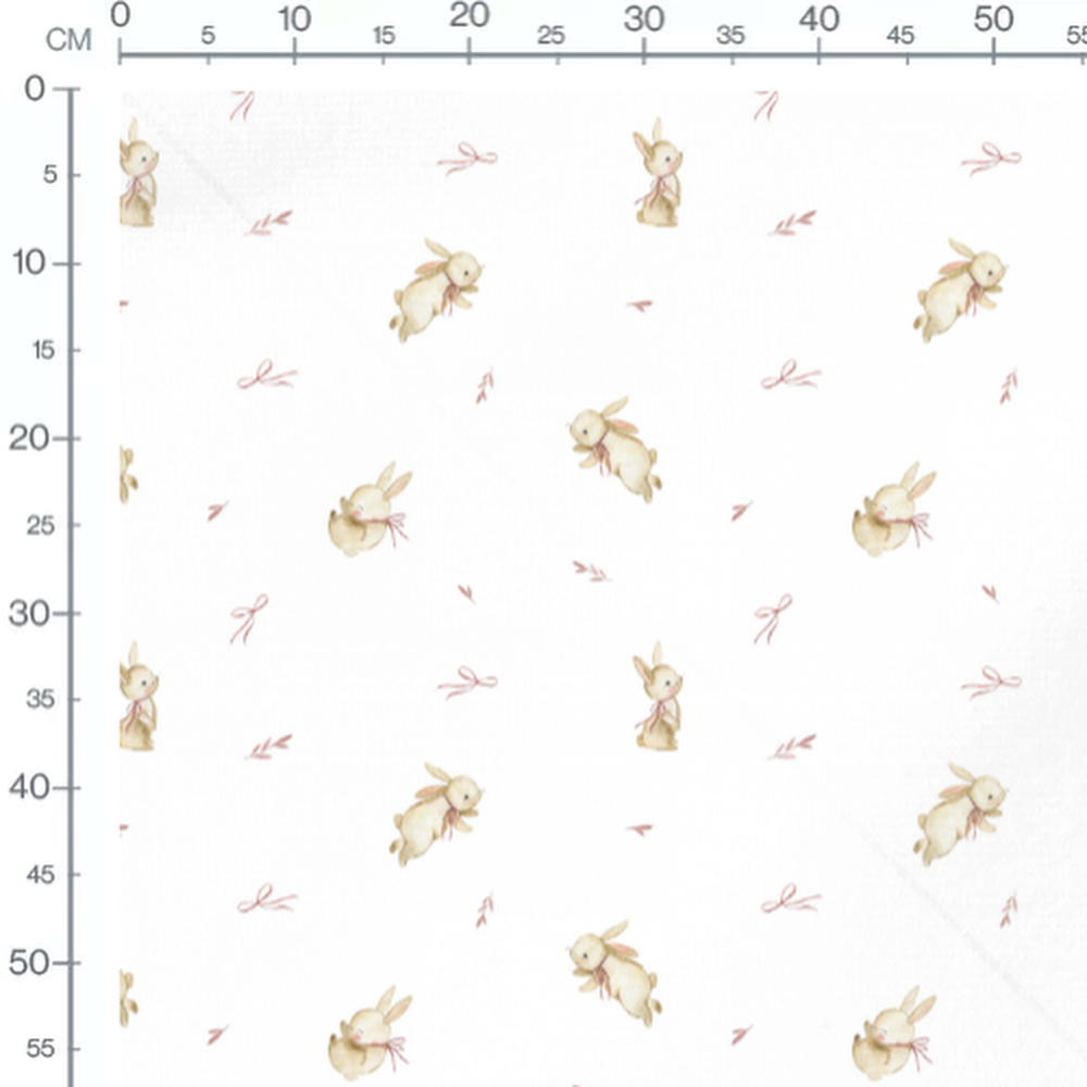 Les lapins sont dessinés dans des tons doux de beige et portent des rubans roses autour du cou. De petites feuilles et des rubans roses ajoutent des détails subtils au motif.Les tissus
