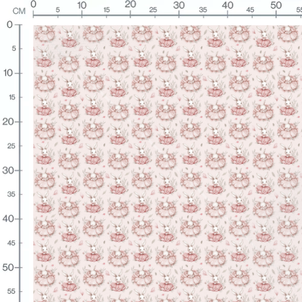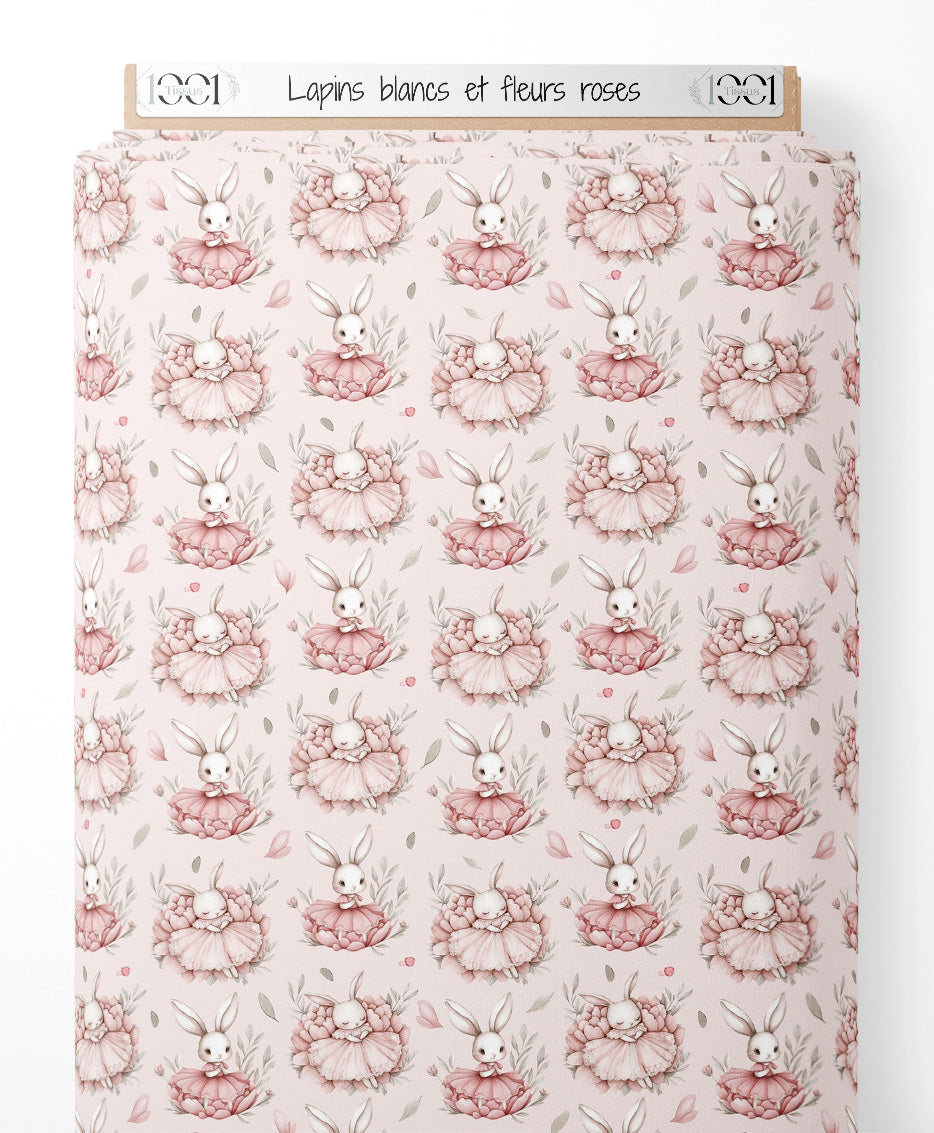 Les lapins portent des robes roses assorties aux fleurs. Les feuilles sont délicatement dessinées en gris et rose. Les pétales ajoutent une touche de douceur au motif.Les tissus