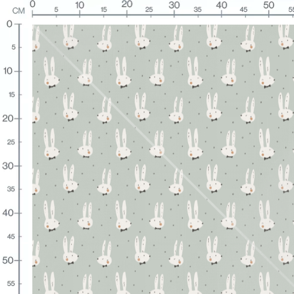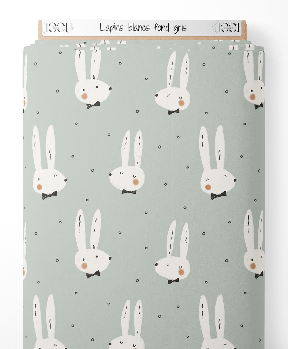 Les lapins ont des joues roses et des oreilles longues. Chaque lapin porte un nœud papillon noir. Le fond gris est parsemé de petits cercles noirs.Les tissus