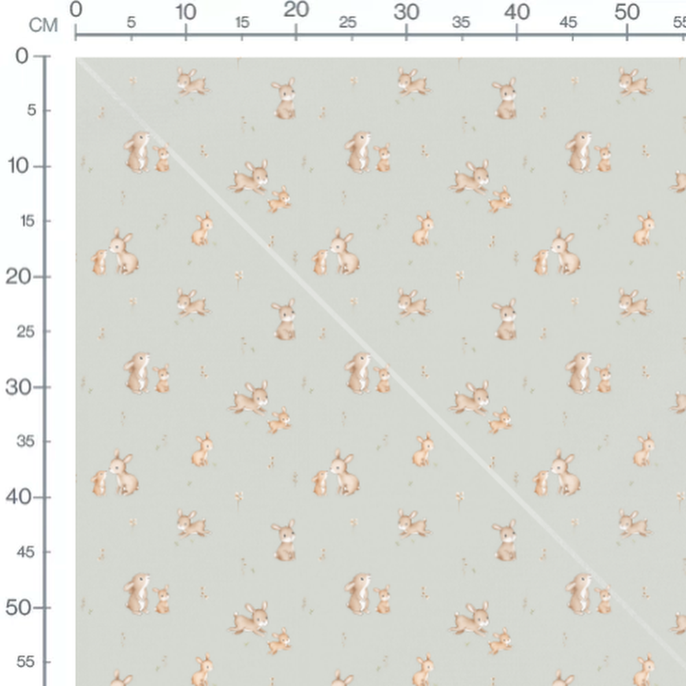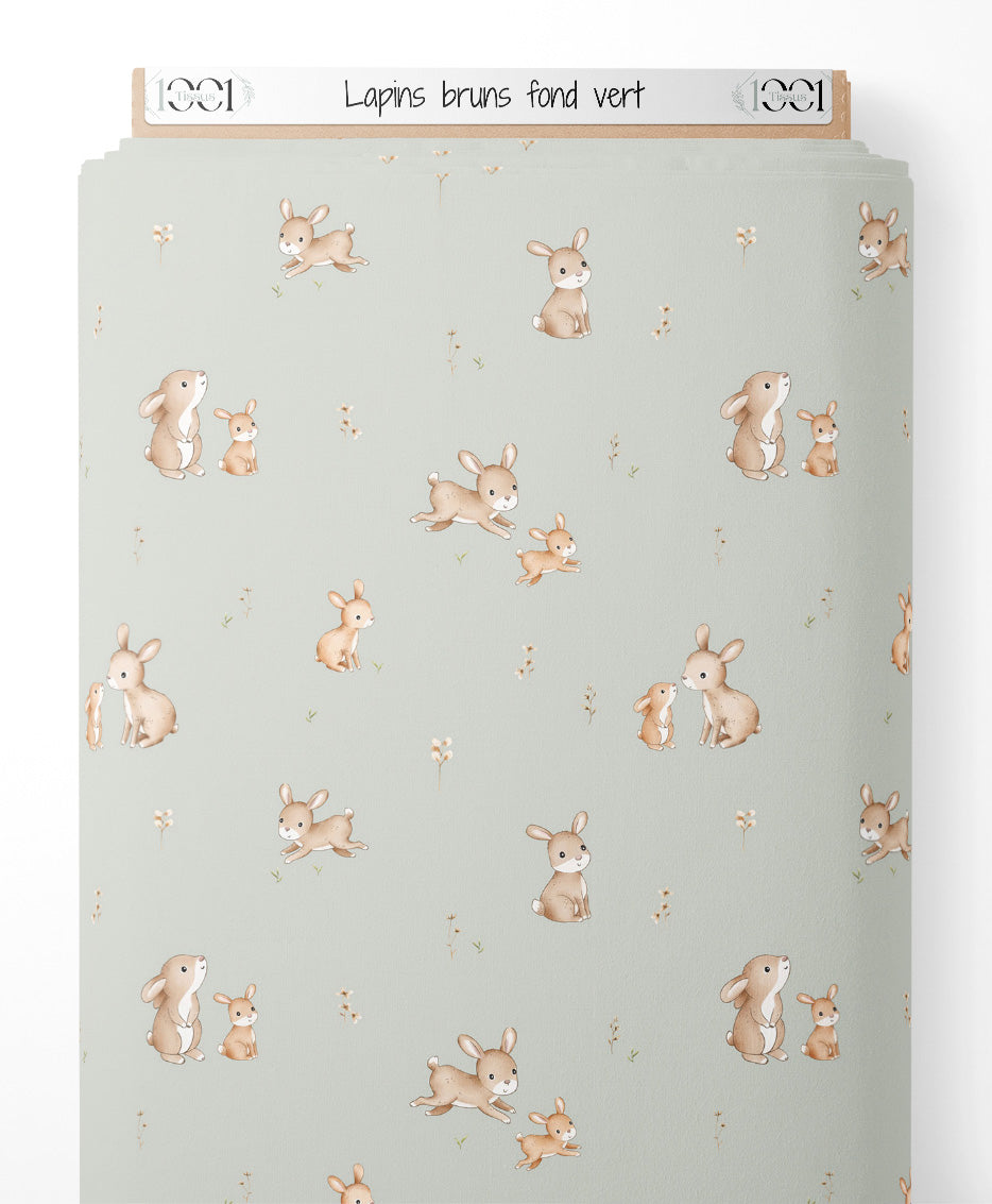 Les lapins sont représentés dans différentes positions, certains assis, d'autres sautant. De petites fleurs blanches ajoutent une touche délicate au motif.Les tissus