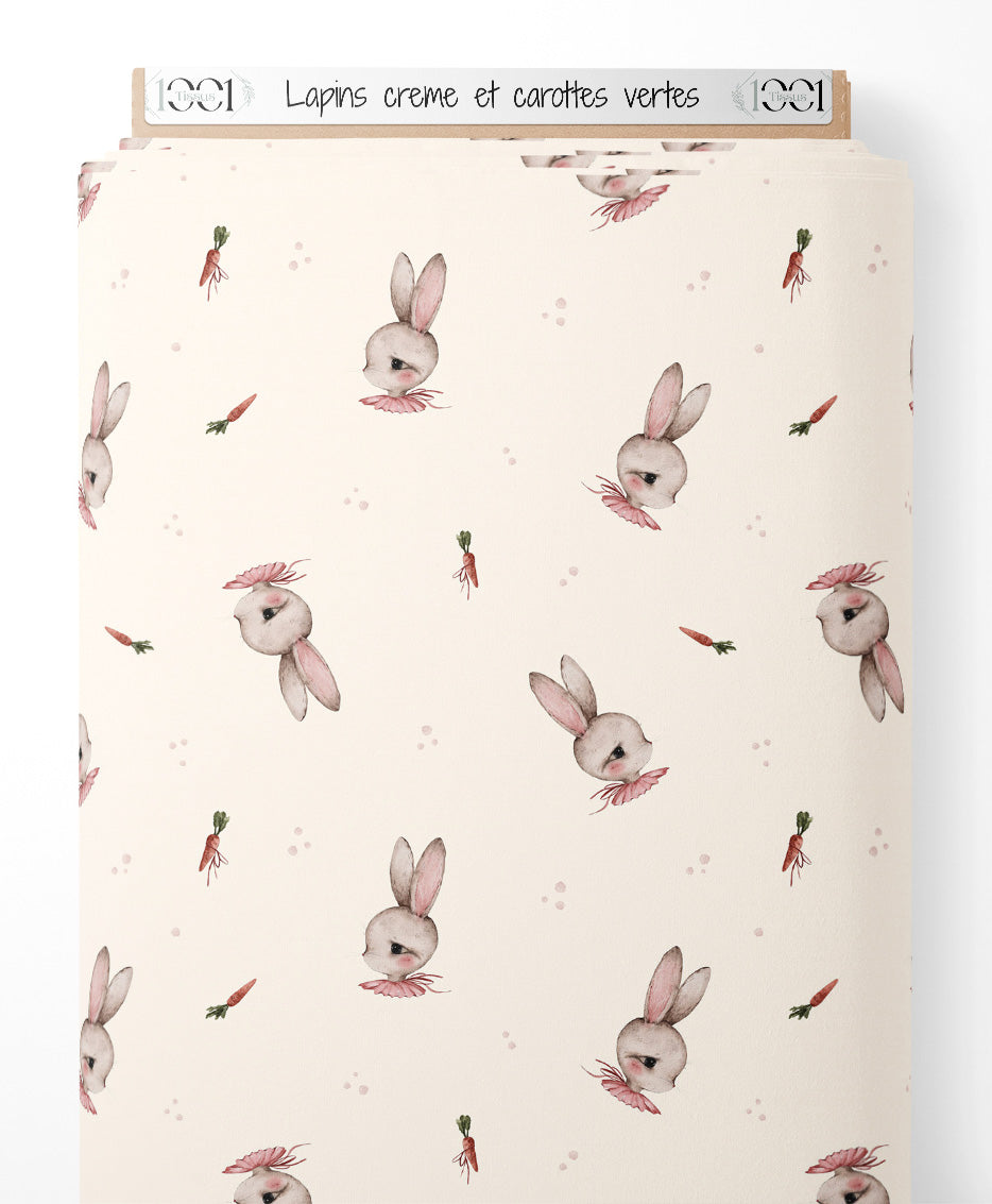 Tissu - Lapins crème et carottes vertes