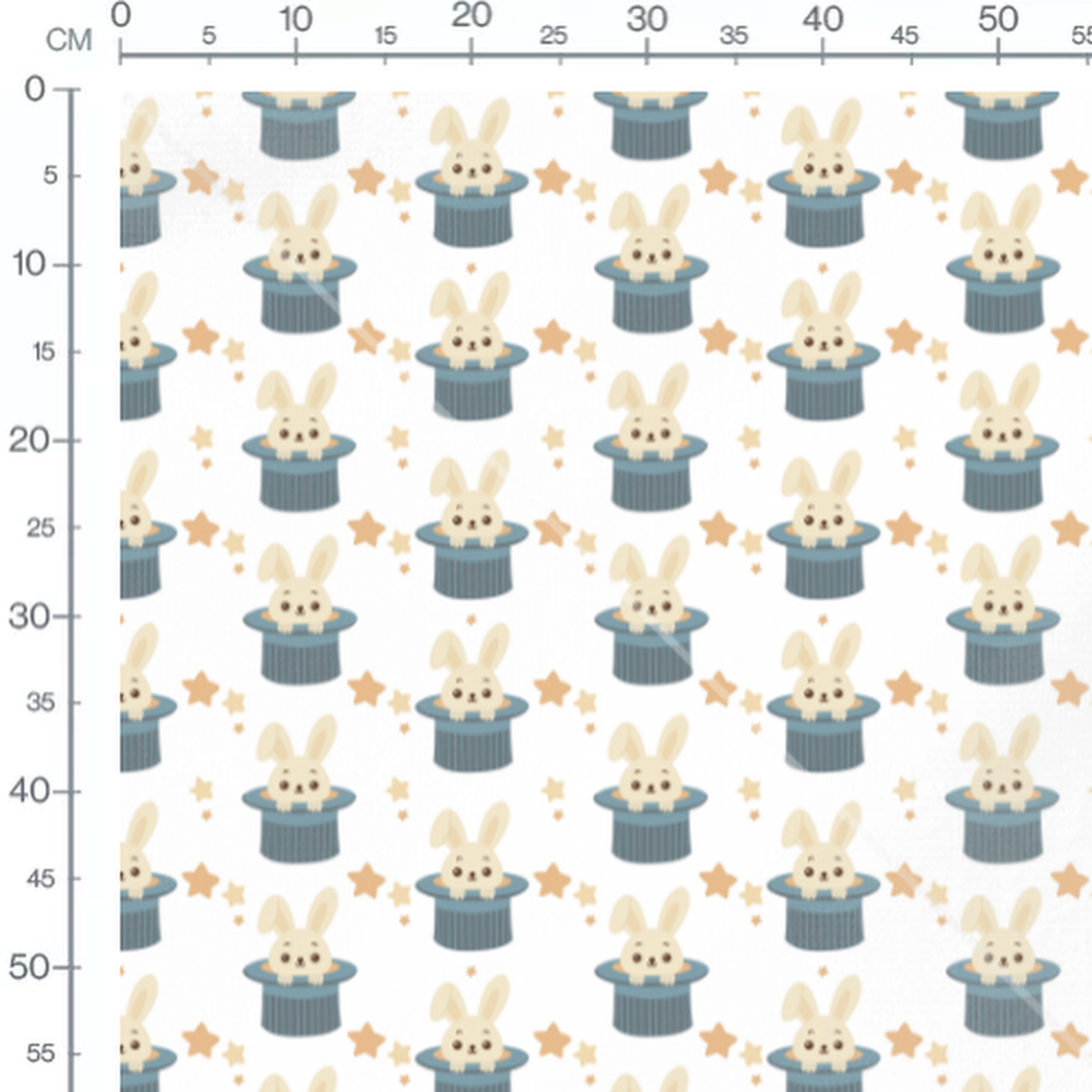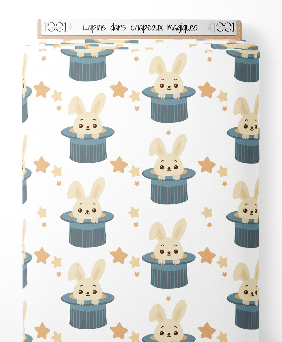 Les lapins ont de grandes oreilles et des expressions adorables. Les chapeaux sont de couleur bleue avec des bandes verticales. Les étoiles orange ajoutent une touche ludique au motif.Les tissus