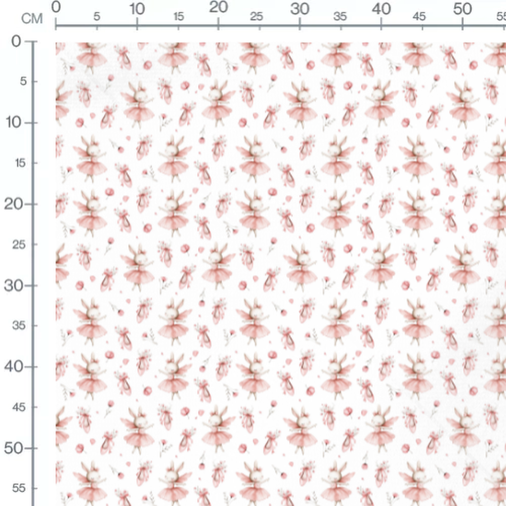 Les lapins portent des tutus roses et des couronnes de fleurs. Des chaussons de danse et des fleurs roses complètent le motif. Les éléments sont délicatement dessinés dans des tons pastel.Les tissus
