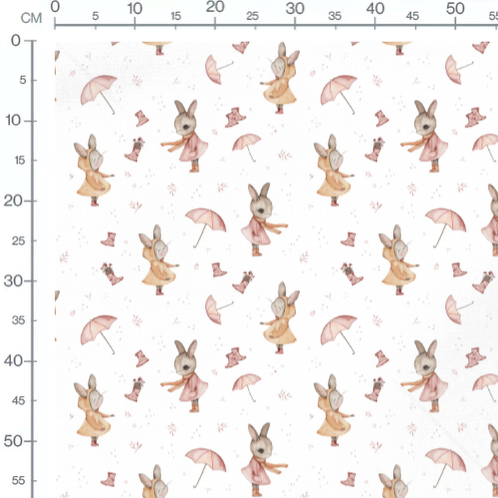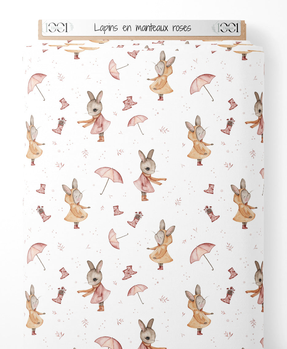 Les lapins portent des manteaux beiges et roses. Les parapluies et bottes sont décorés de motifs floraux. De petites feuilles et points complètent le motif.Les tissus