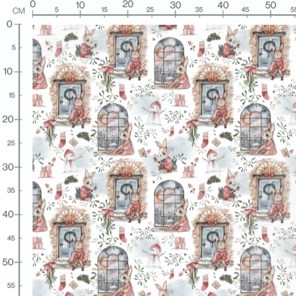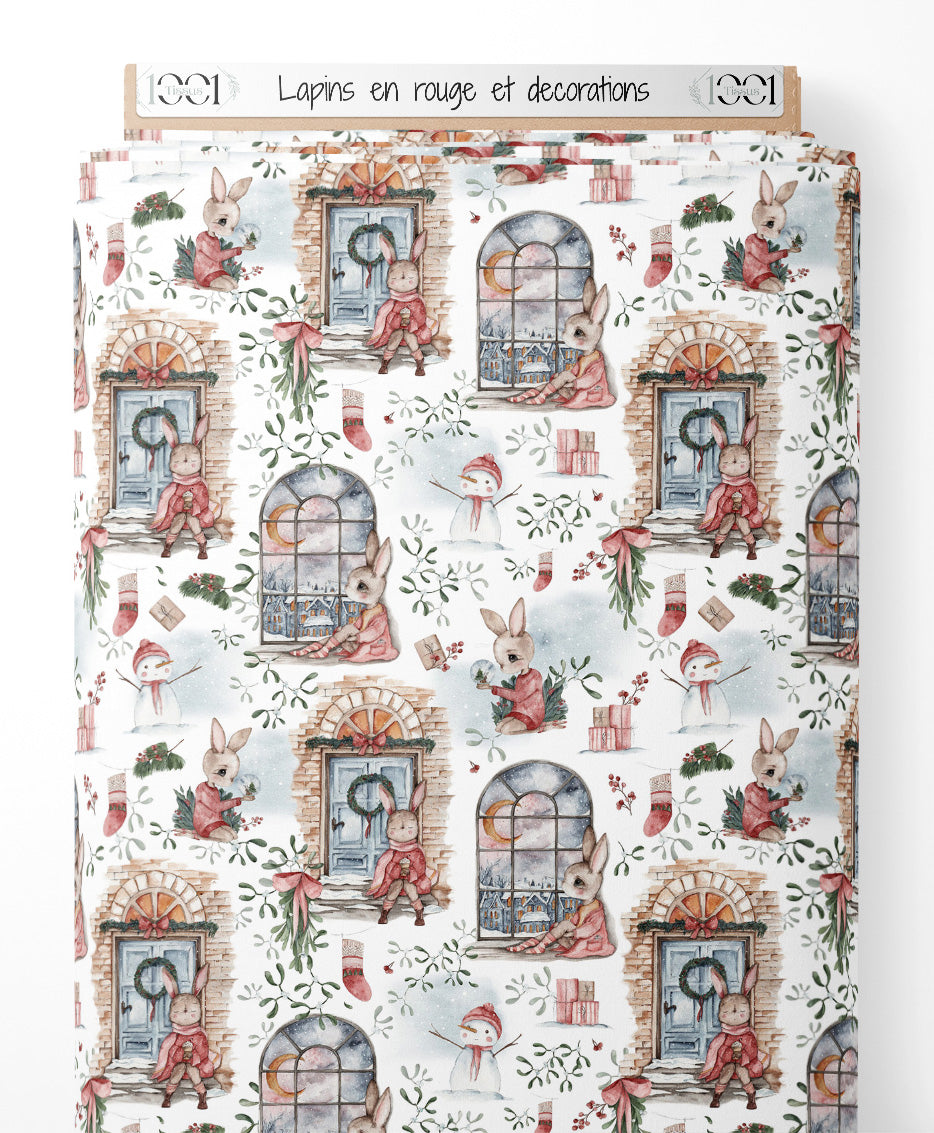 Les lapins portent des vêtements rouges festifs et sont entourés de décorations de Noël. Des fenêtres avec des couronnes et des paysages enneigés ajoutent une touche hivernale. Des bonhommes de neige avec des écharpes rouges complètent le motif. Des branches de houx et des chaussettes de Noël sont dispersées sur le fond blanc.Les tissus