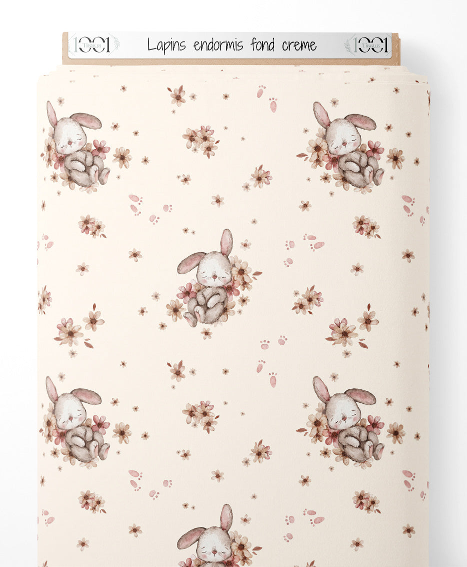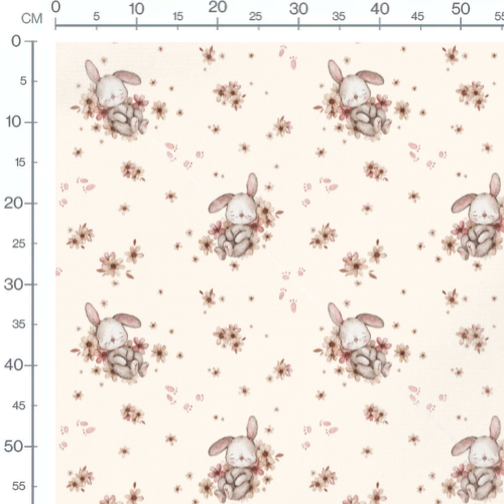 Les lapins sont dessinés dans des tons doux de brun et de rose. Les fleurs autour des lapins sont dans des nuances de beige et de rose. Les empreintes ajoutent une touche ludique au motif.Les tissus