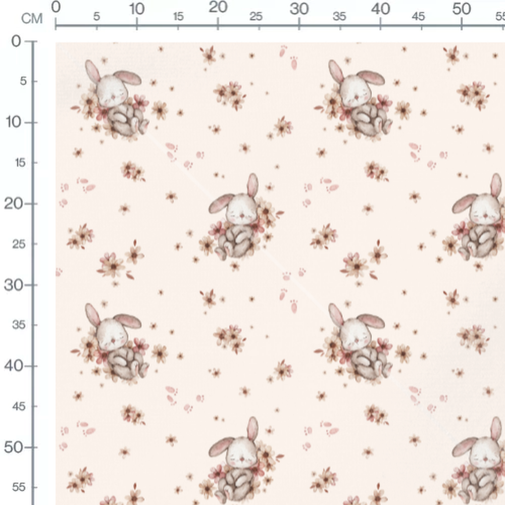 Les lapins sont dessinés dans des tons doux et apaisants. Les fleurs autour des lapins sont de couleur rose et beige. Les empreintes ajoutent une touche ludique au motif.Les tissus
