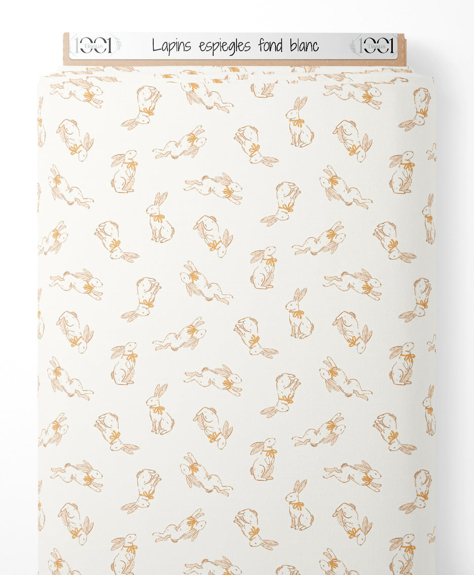 Les lapins sont représentés dans différentes positions, ajoutant une touche ludique au motif. Le nœud autour du cou de chaque lapin est de couleur orange. Le fond blanc met en valeur les dessins délicats des lapins.Les tissus