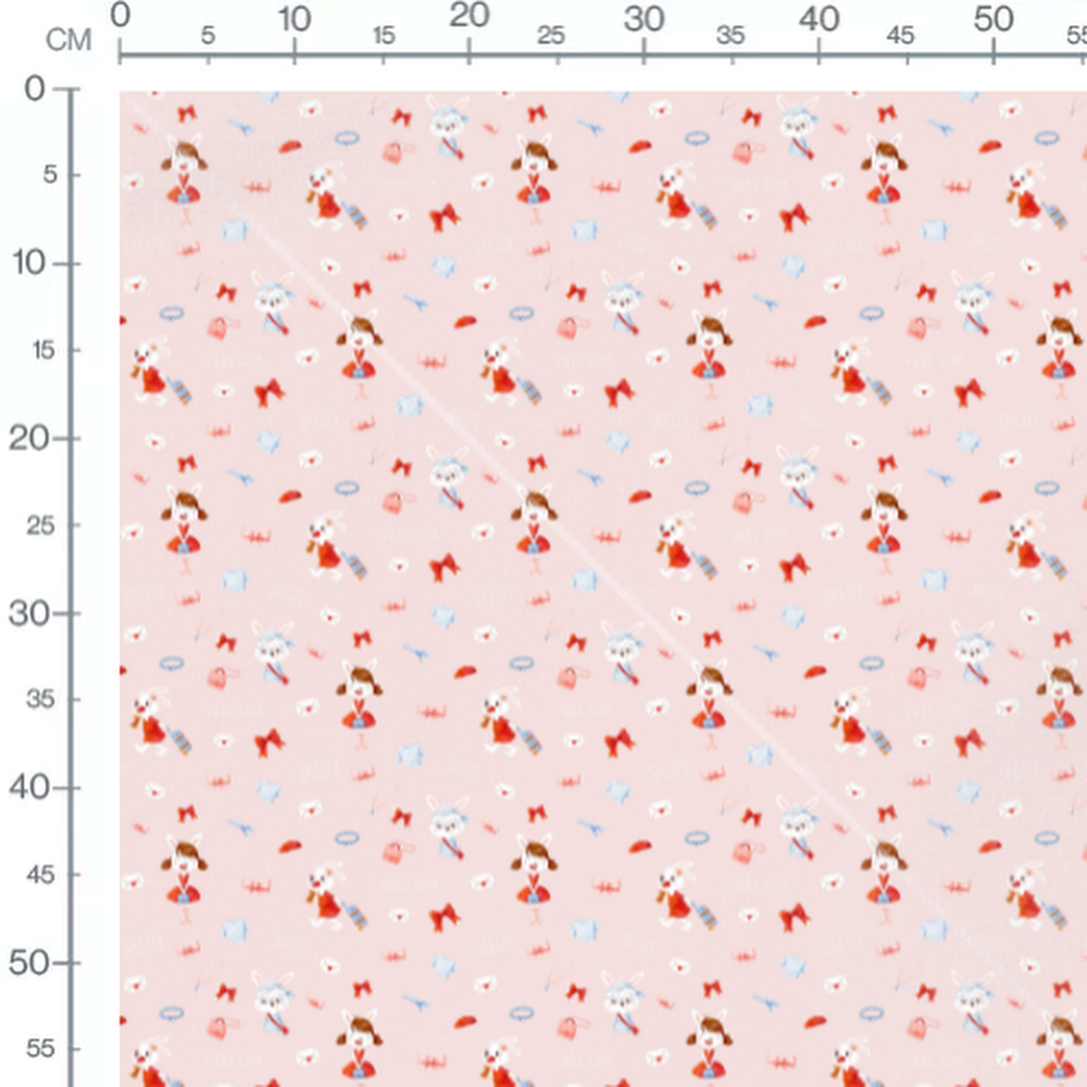 Les lapins portent des vêtements rouges et bleus. Des accessoires comme des sacs, des nœuds et des chapeaux sont dispersés. Des lettres blanches et des motifs de vêtements ajoutent des détails. Le fond rose est parsemé de petits points blancs.Les tissus