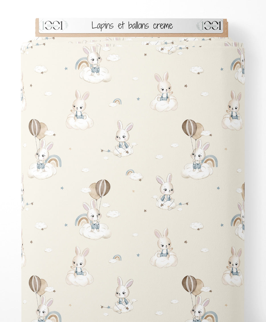 Les lapins portent des vêtements bleus et tiennent des ballons marron. De petits nuages blancs et des arcs-en-ciel ajoutent une touche de couleur douce. Des étoiles grises et beiges parsèment le fond clair.Les tissus