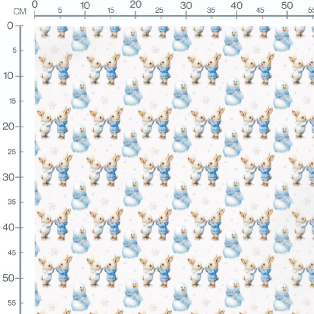 Les lapins portent des pulls et écharpes bleus et blancs. Les bonhommes de neige sont décorés d'écharpes bleues. De petits flocons de neige et des boules blanches ajoutent une touche hivernale.Les tissus