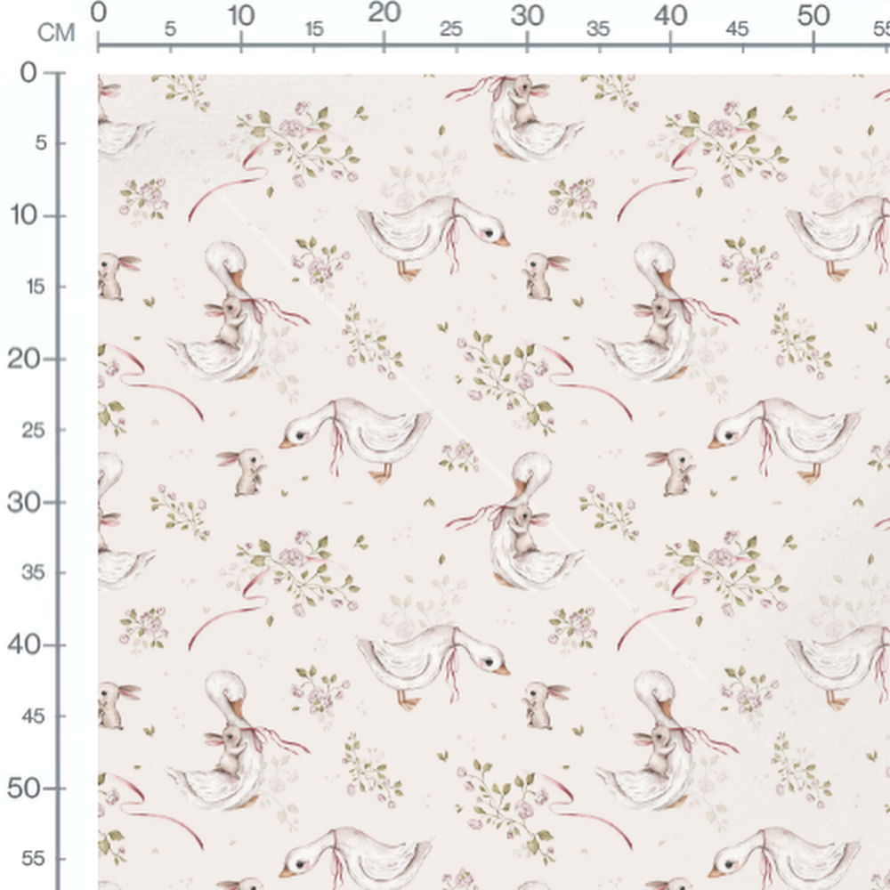 Les canards portent des rubans rouges autour du cou. Les lapins sont assis ou debout près des canards. Les fleurs sont délicates avec des nuances de rose et de vert.Les tissus