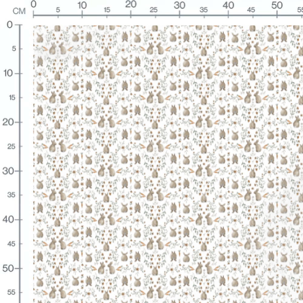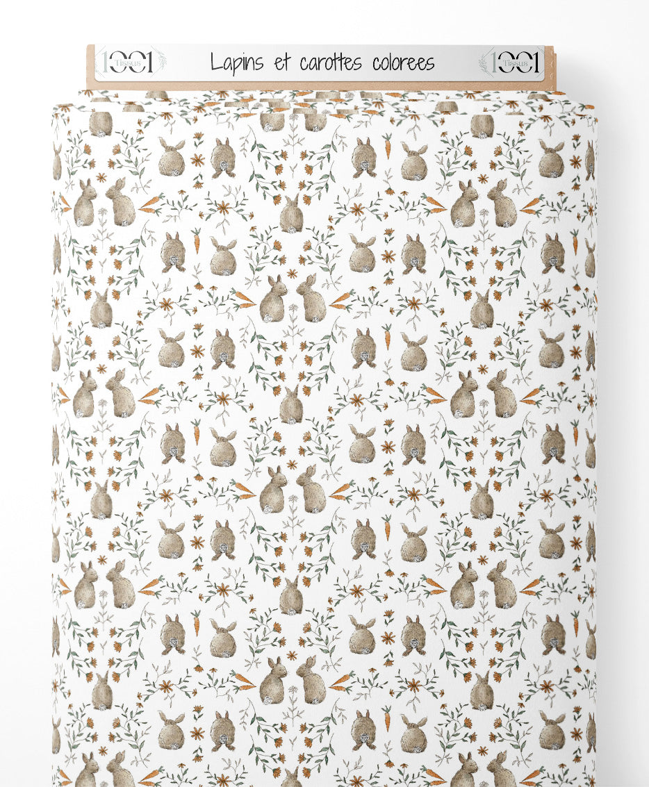Les lapins sont entourés de petites fleurs brunes et de feuillages verts. Les carottes ajoutent une touche de couleur vive au motif. Le fond blanc met en valeur les éléments naturels du design.Les tissus
