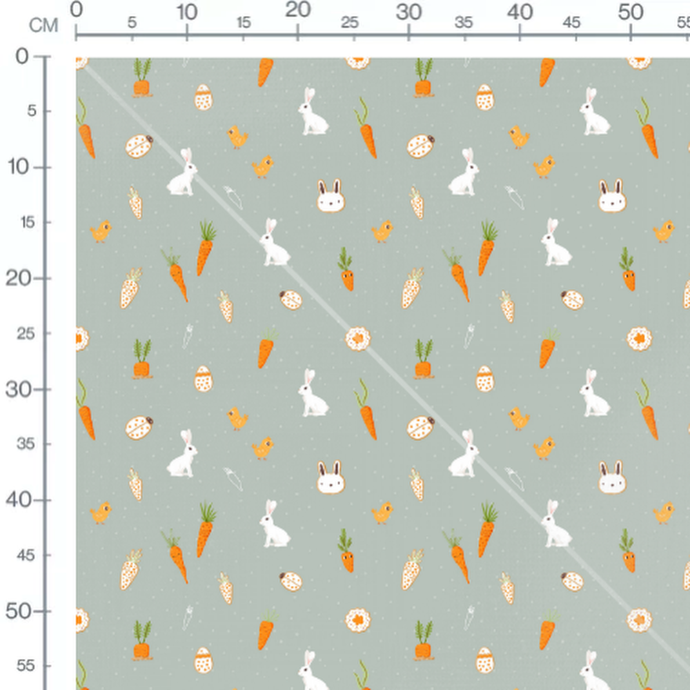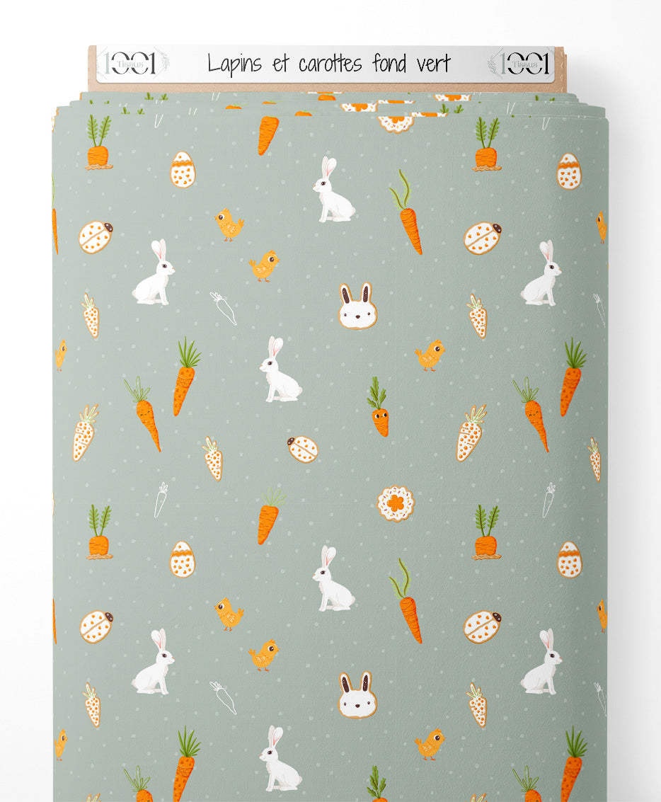 Les lapins sont assis et entourés de carottes de différentes tailles. Des poussins jaunes ajoutent une touche ludique au motif. Des motifs de biscuits et de pois blancs complètent le design.Les tissus