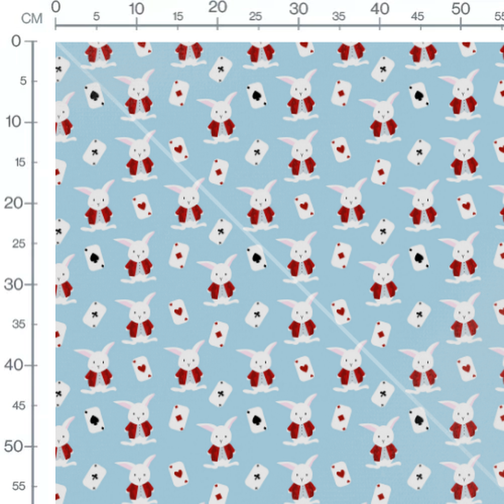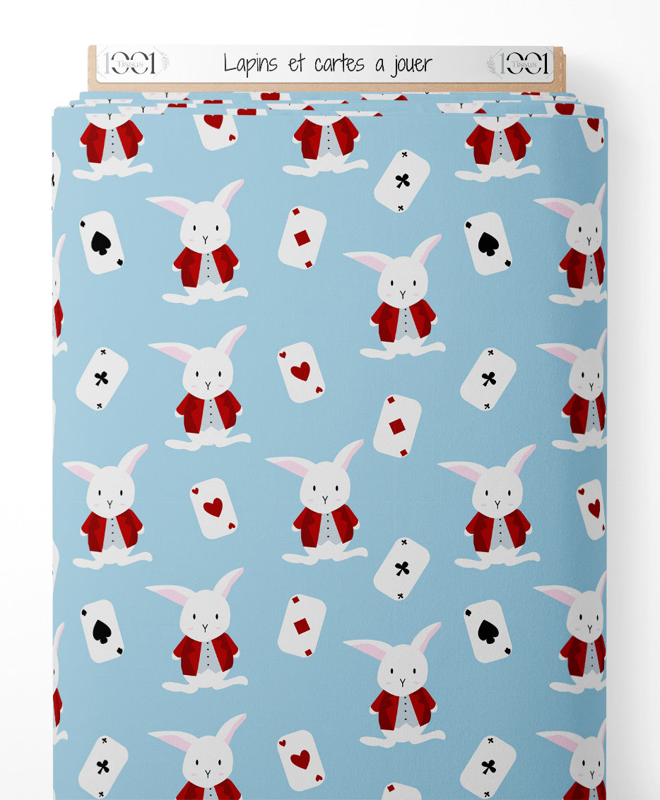 Les lapins portent des vestes rouges et ont de longues oreilles roses. Les cartes à jouer présentent des cœurs, des piques, des carreaux et des trèfles.Les tissus