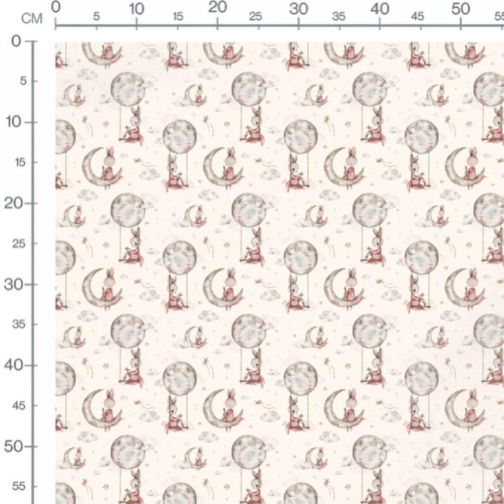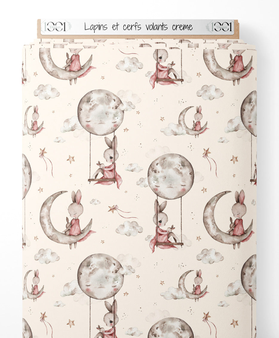 Les lapins portent des vêtements roses et sont assis sur des lunes grises. Des nuages blancs flottent autour avec des étoiles dorées. Des cerfs-volants ajoutent une touche de fantaisie sur le fond crème.Les tissus