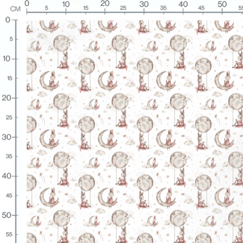 Les lapins portent des vêtements roses et sont assis sur des lunes grises. Des nuages blancs et des étoiles dorées parsèment le fond. Des cerfs-volants rouges ajoutent une touche de couleur. Le motif évoque un univers onirique et céleste.Les tissus