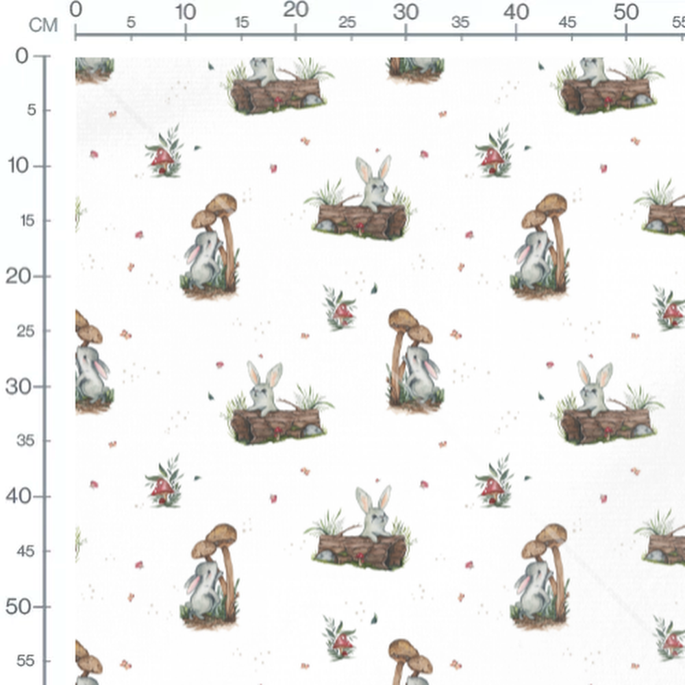 Les lapins sont assis près de troncs d'arbres et de champignons. Des herbes vertes et des petites fleurs rouges ajoutent des détails naturels. Le fond blanc met en valeur les éléments du motif.Les tissus