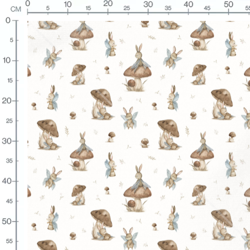 Les lapins portent des ailes bleues translucides. Les champignons sont de différentes tailles et nuances de brun. Quelques petites herbes beige ajoutent des détails subtils.Les tissus