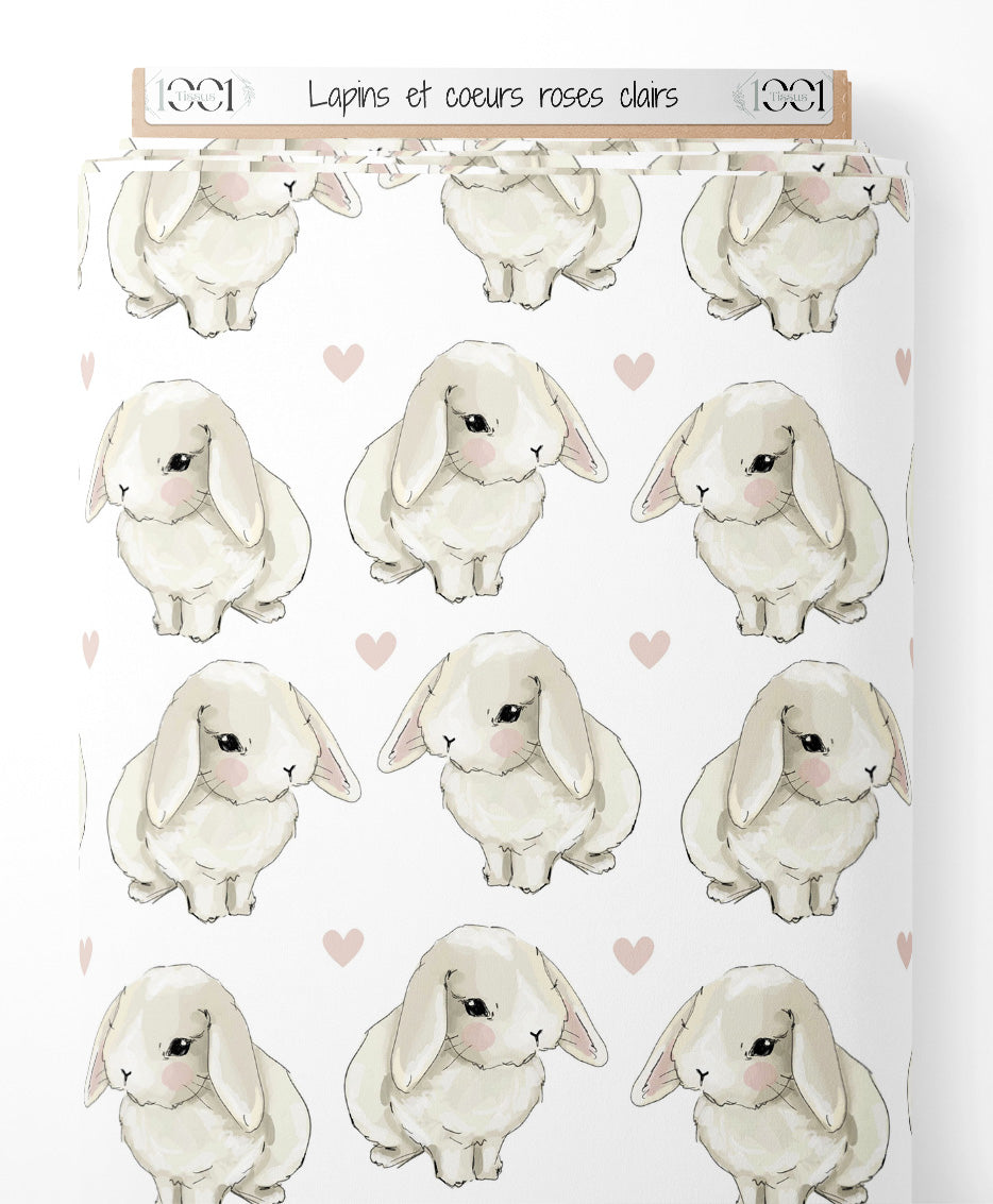 Les lapins ont des oreilles tombantes et des yeux noirs. Les cœurs sont uniformément répartis entre les lapins.Les tissus