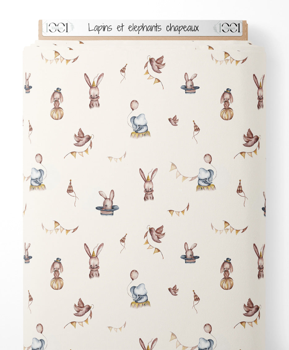 Les lapins portent des chapeaux et sont accompagnés d'éléphants. Des oiseaux et des ballons complètent le motif. Les fanions ajoutent une touche festive au fond crème.Les tissus