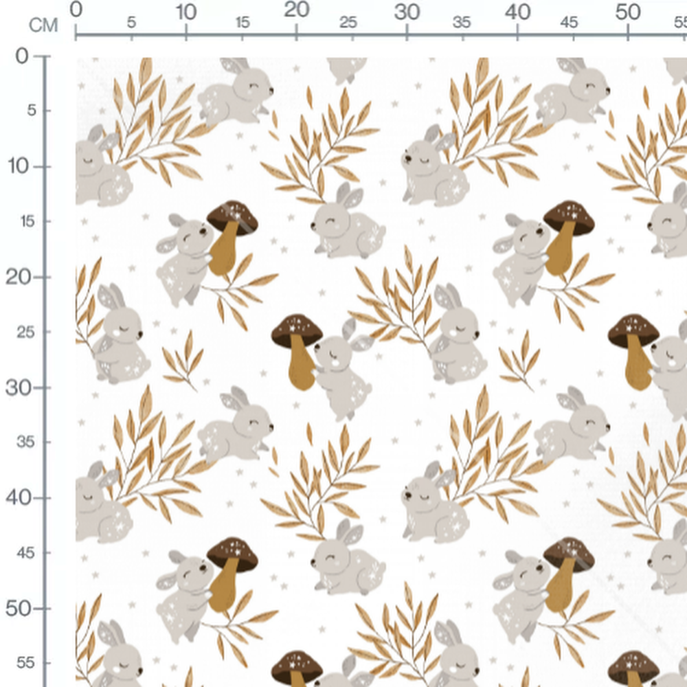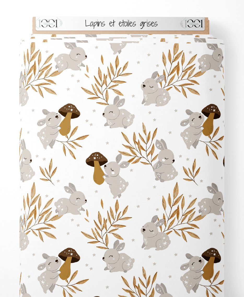Les lapins sont illustrés dans différentes positions, certains tenant des champignons. Les feuilles marron ajoutent une touche naturelle au motif.Les tissus