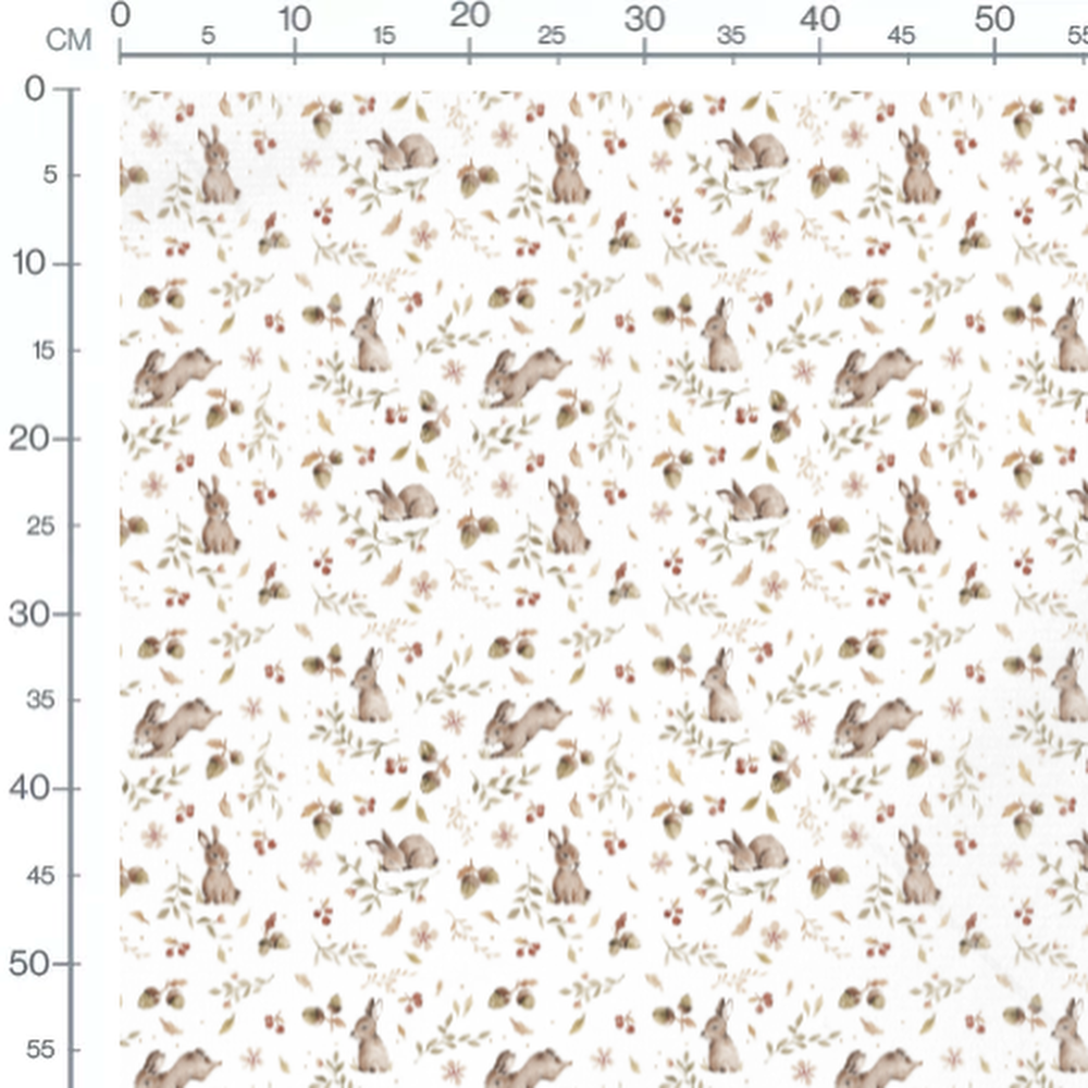 Les lapins sont représentés dans différentes positions. Le feuillage est délicatement dessiné en vert pâle. Les fleurs roses ajoutent une touche de douceur au motif. Les baies rouges apportent un contraste subtil.Les tissus