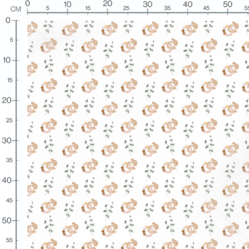 Les lapins sont entourés de cercles colorés. Le feuillage vert ajoute une touche naturelle.Les tissus