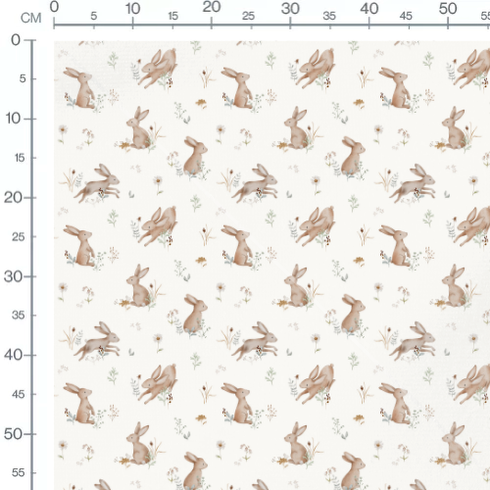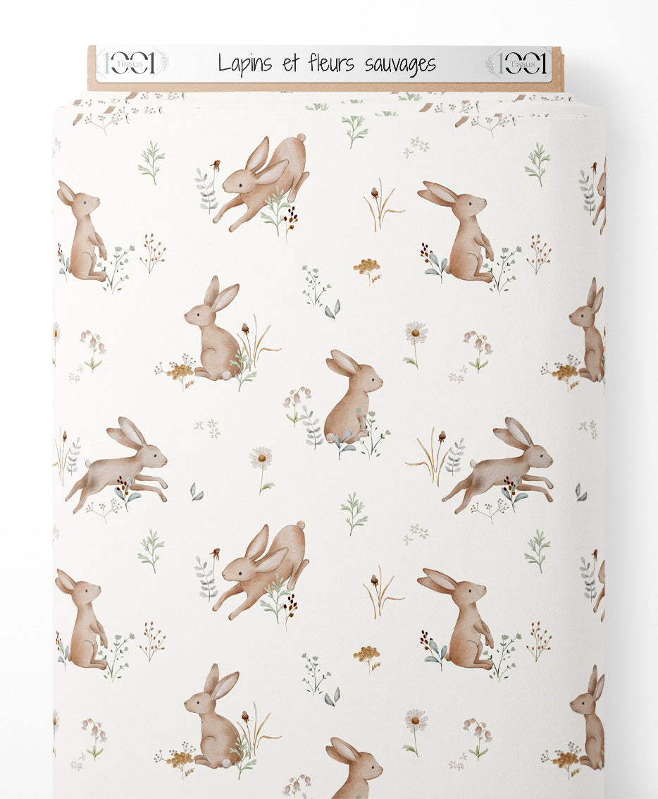 Les lapins sont assis ou en mouvement, entourés de fleurs délicates. Les fleurs incluent des marguerites et d'autres petites plantes. Les couleurs sont principalement des tons de brun, vert et blanc.Les tissus