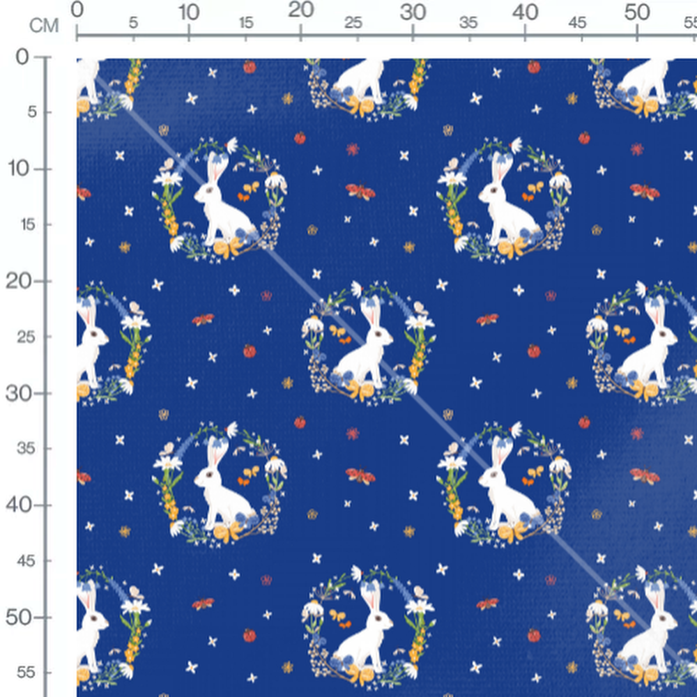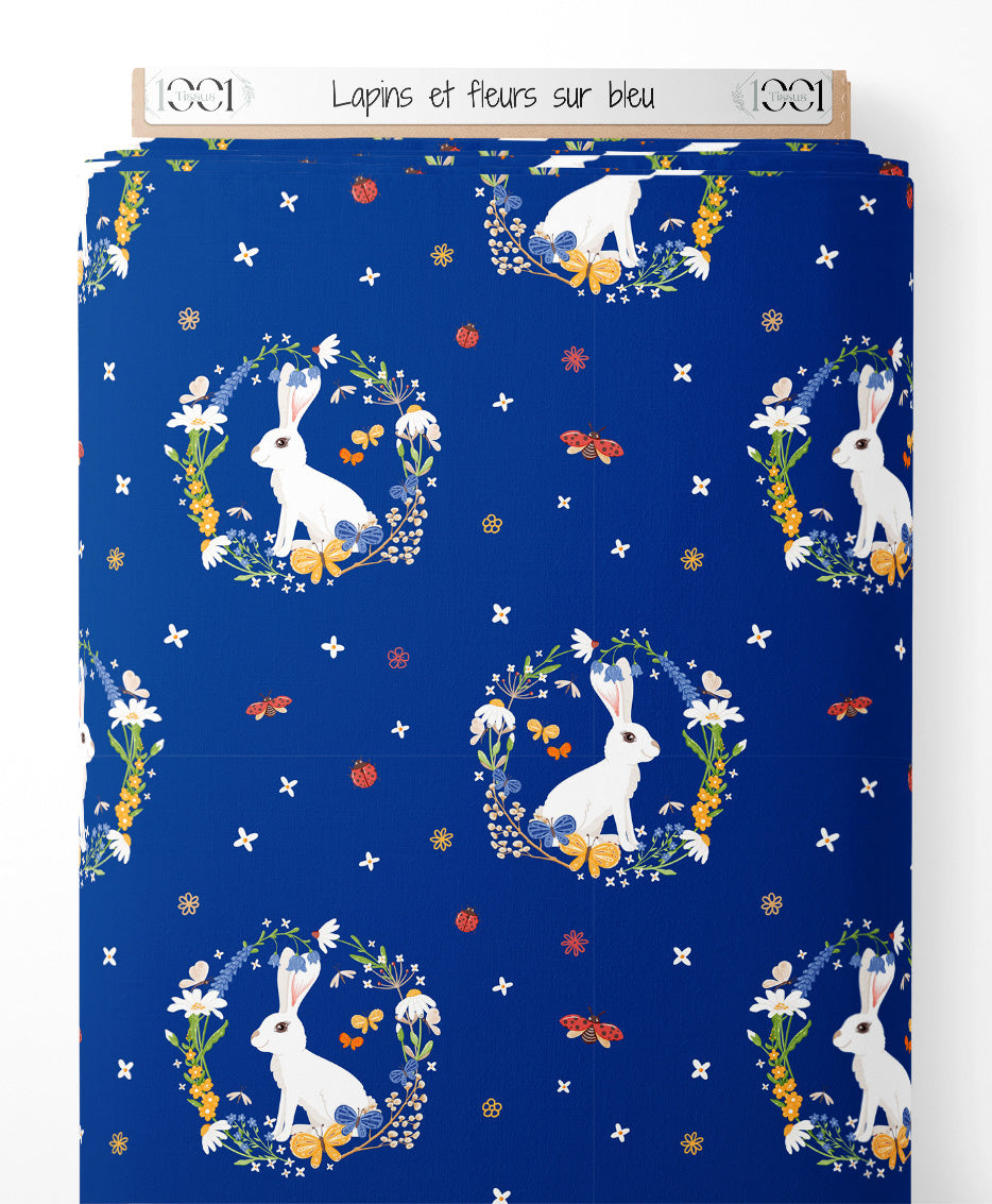 Les lapins sont entourés de marguerites blanches et de fleurs jaunes et bleues. Des coccinelles rouges et des motifs floraux ajoutent des touches de couleur. Le fond bleu met en valeur les éléments du motif.Les tissus