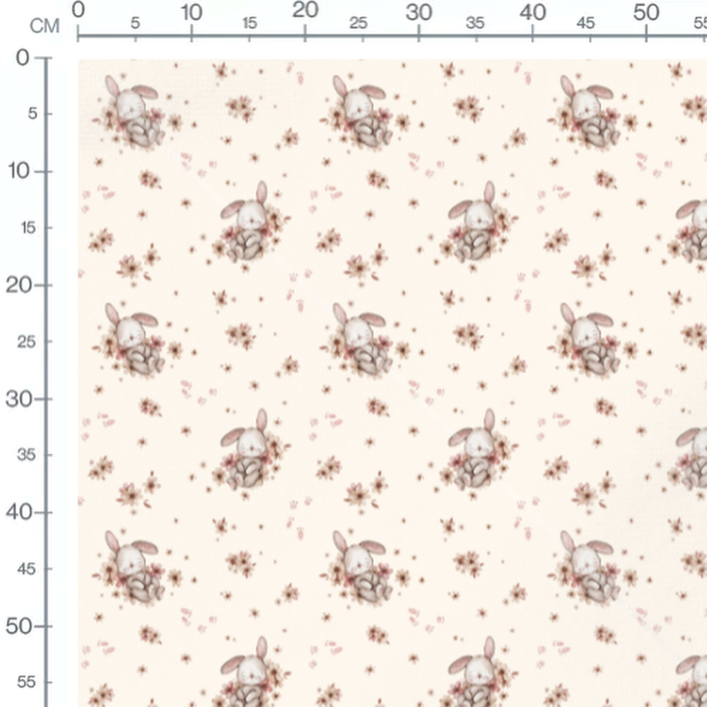 Les lapins sont accompagnés de fleurs dans des tons doux. Les empreintes ajoutent une touche ludique au motif.Les tissus