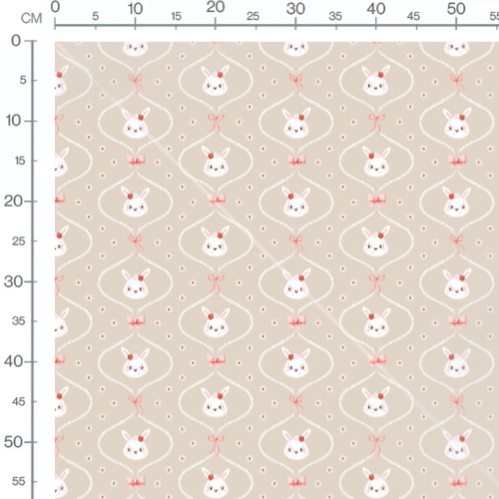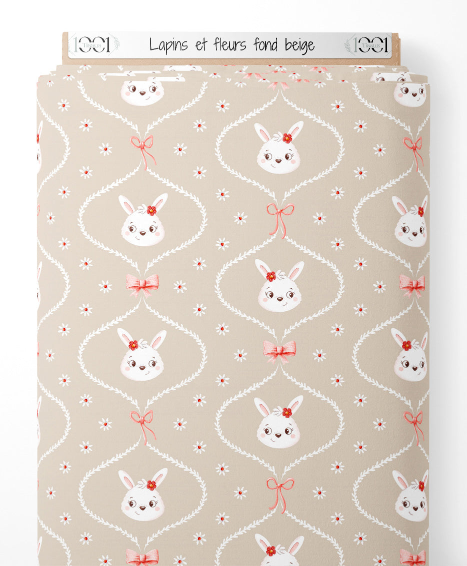Les lapins ont des oreilles roses et des fleurs rouges sur la tête. Les petites fleurs blanches sont dispersées autour des lapins. Des nœuds roses ajoutent une touche décorative au motif.Les tissus