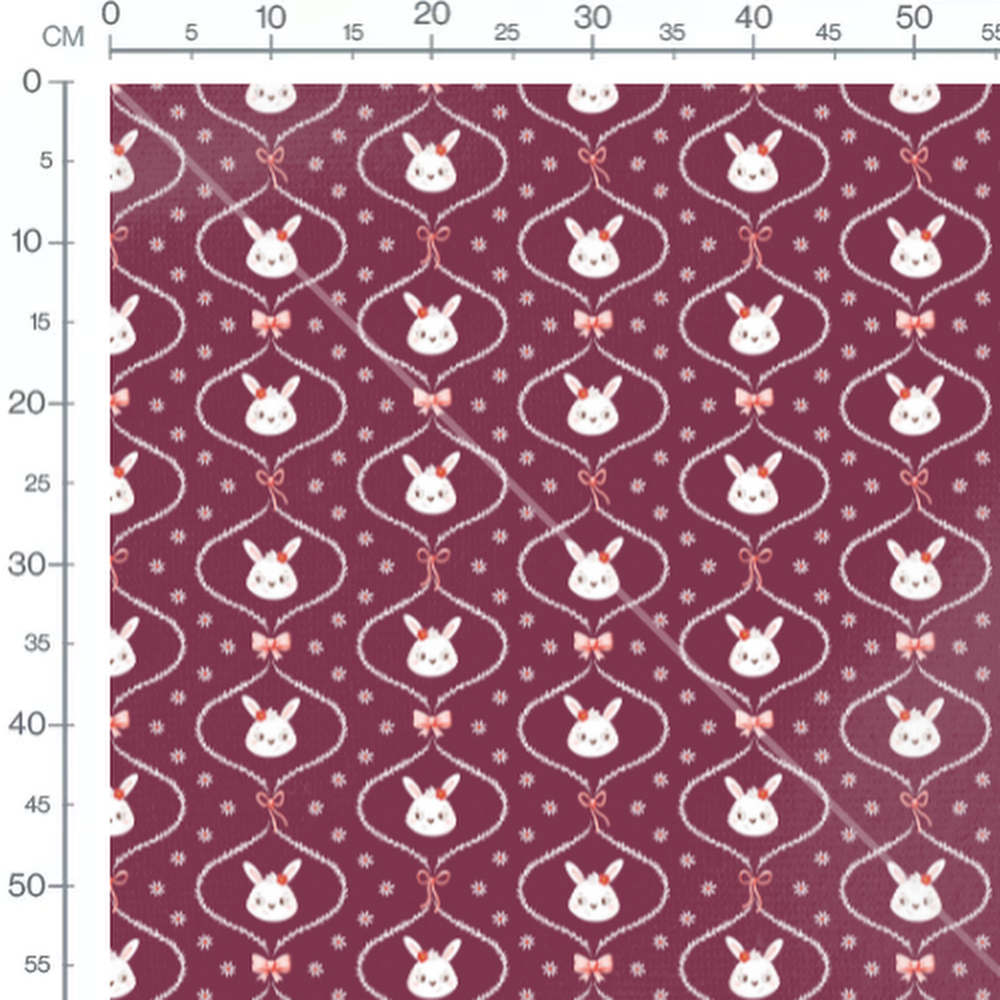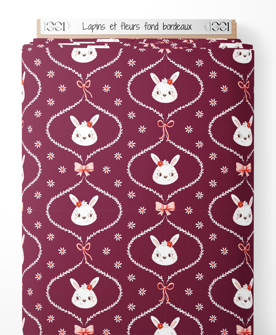 Les lapins ont des oreilles roses et des fleurs rouges sur la tête. Des guirlandes de feuilles blanches entourent les motifs. Les nœuds roses ajoutent une touche délicate au design.Les tissus