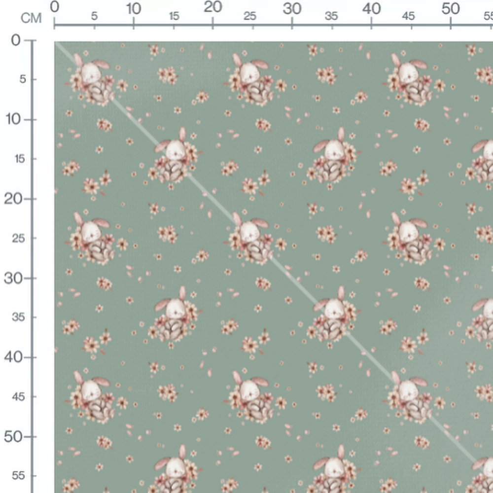 Les lapins sont dessinés avec des détails doux et entourés de fleurs délicates. Les fleurs varient en taille et en couleur, ajoutant une touche de charme. Le fond vert pastel met en valeur les éléments du motif.Les tissus