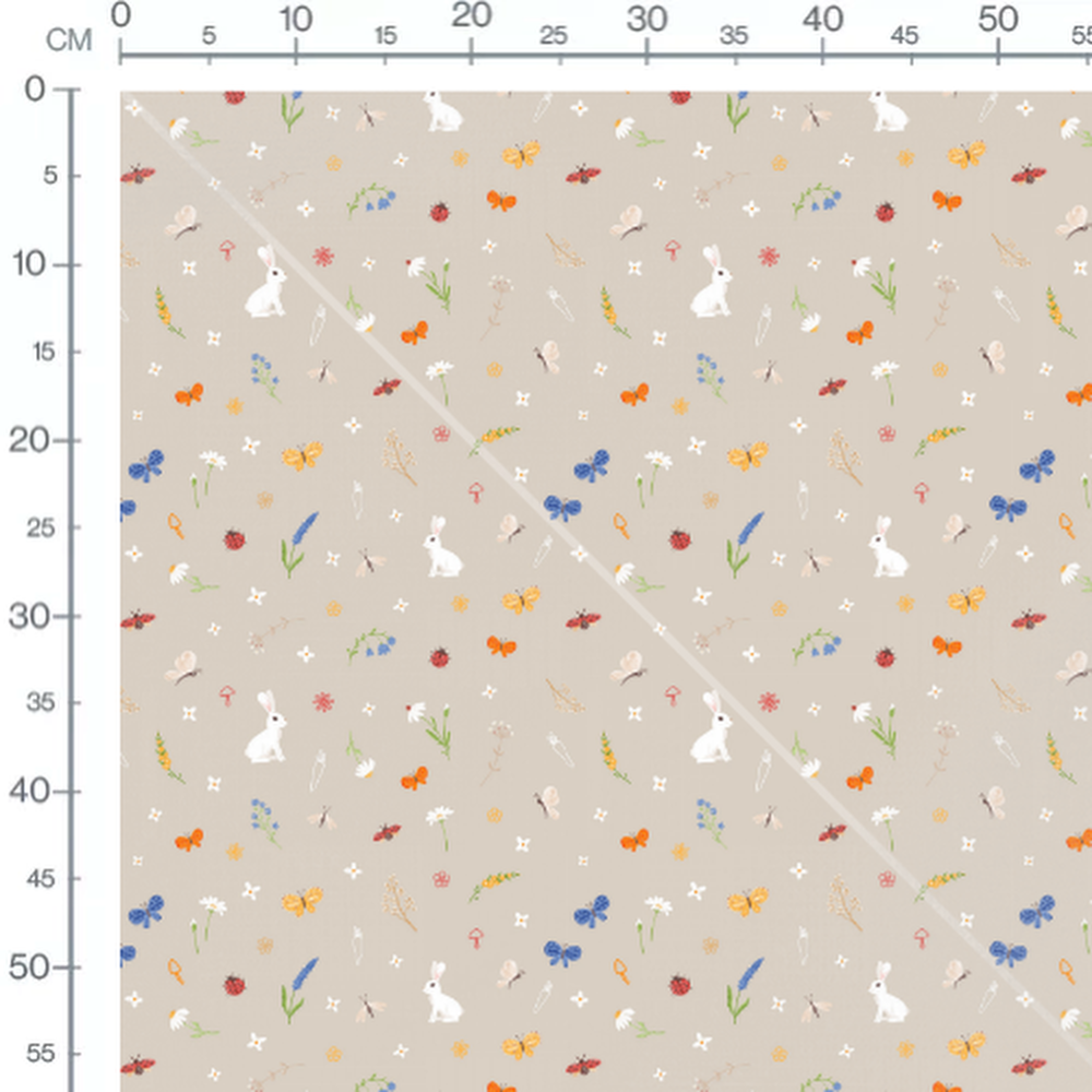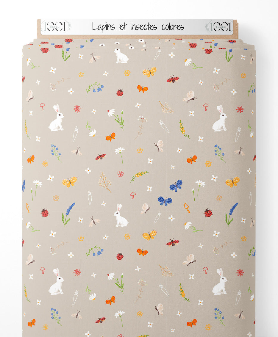 Coccinelles rouges et champignons rouges dispersés. Petites fleurs blanches et bleues avec des touches de vert. Abeilles et libellules beige clair ajoutent une touche délicate.Les tissus