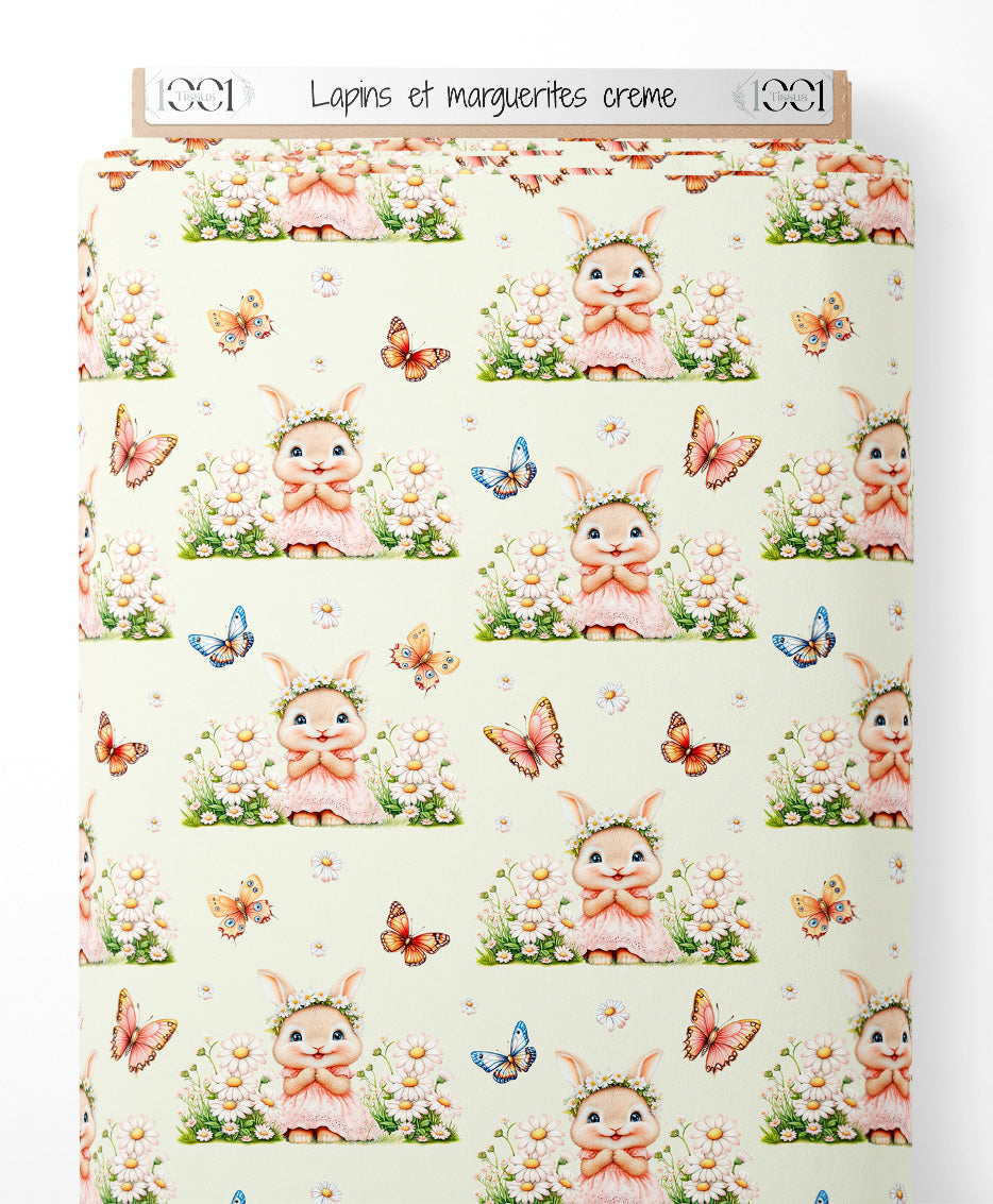 Les lapins portent des couronnes de fleurs et sont assis parmi les marguerites. Les papillons présentent des motifs détaillés et des couleurs vives. Le fond crème met en valeur les éléments colorés du motif.Les tissus