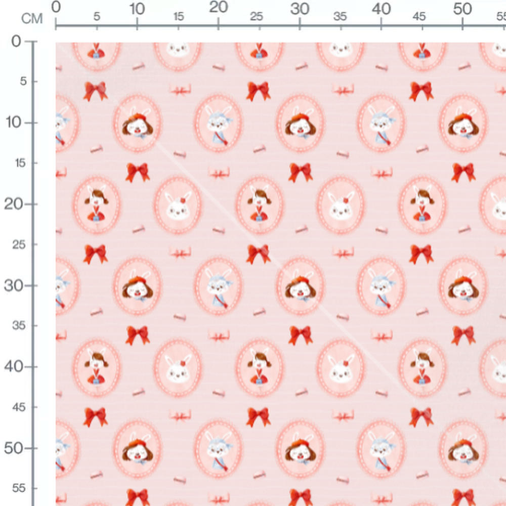 Les lapins portent des vêtements colorés et sourient. Les noeuds rouges et roses ajoutent une touche élégante. Les macarons roses sont dispersés entre les motifs. Les cadres ovales entourent les lapins, créant un effet de portrait.Les tissus