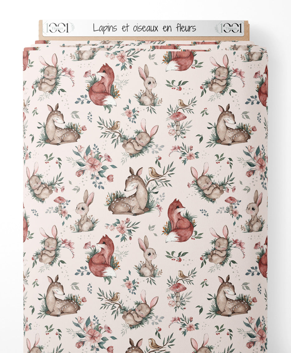 Les lapins sont accompagnés de renards et d'oiseaux, tous entourés de feuillages et de fleurs délicates. Les couleurs pastel ajoutent une touche douce et apaisante au motif. Les fleurs sont dans des teintes de rose et de vert, complétant harmonieusement les animaux. Les détails des animaux et des plantes sont finement dessinés, créant une ambiance paisible et naturelle.Les tissus