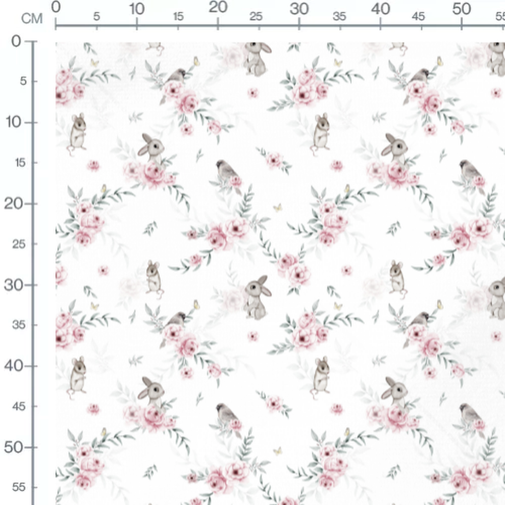 Les fleurs roses sont entourées de feuilles vertes. Les lapins et les souris sont dessinés dans des tons gris doux. Les oiseaux sont posés près des fleurs. Les papillons ajoutent une touche de couleur vive.Les tissus