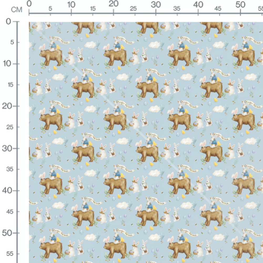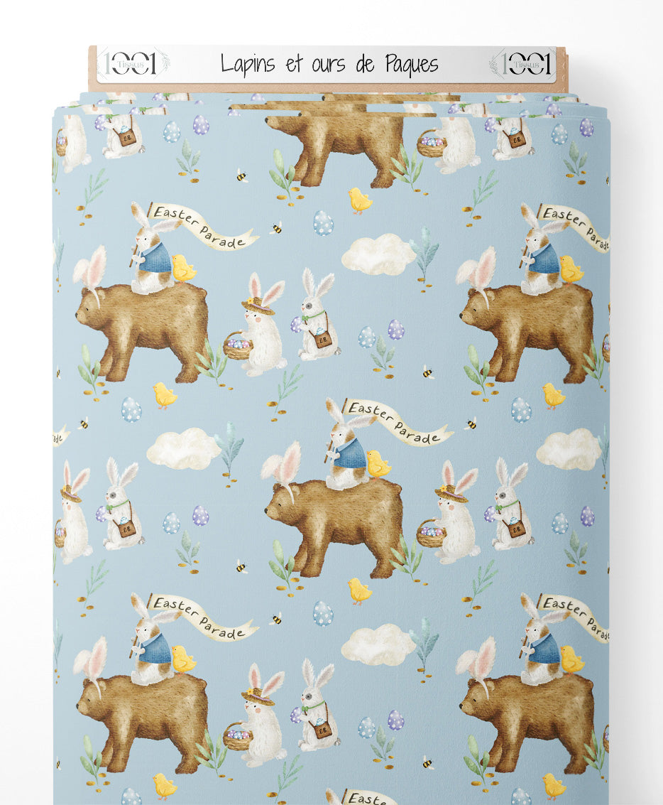 Petits poussins jaunes et abeilles autour des lapins. Bannières 'Easter Parade' tenues par les lapins. Plantes vertes et nuages épars complètent le motif.Les tissus